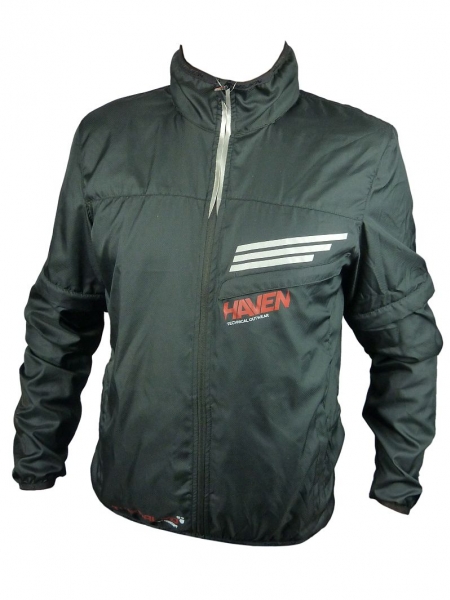Neprofukavá a částečně nepromokavá bunda s kapucí a odnímatelnými rukávy na pažích (tvar trika), tato vesta pak chrání před chladem ramena.